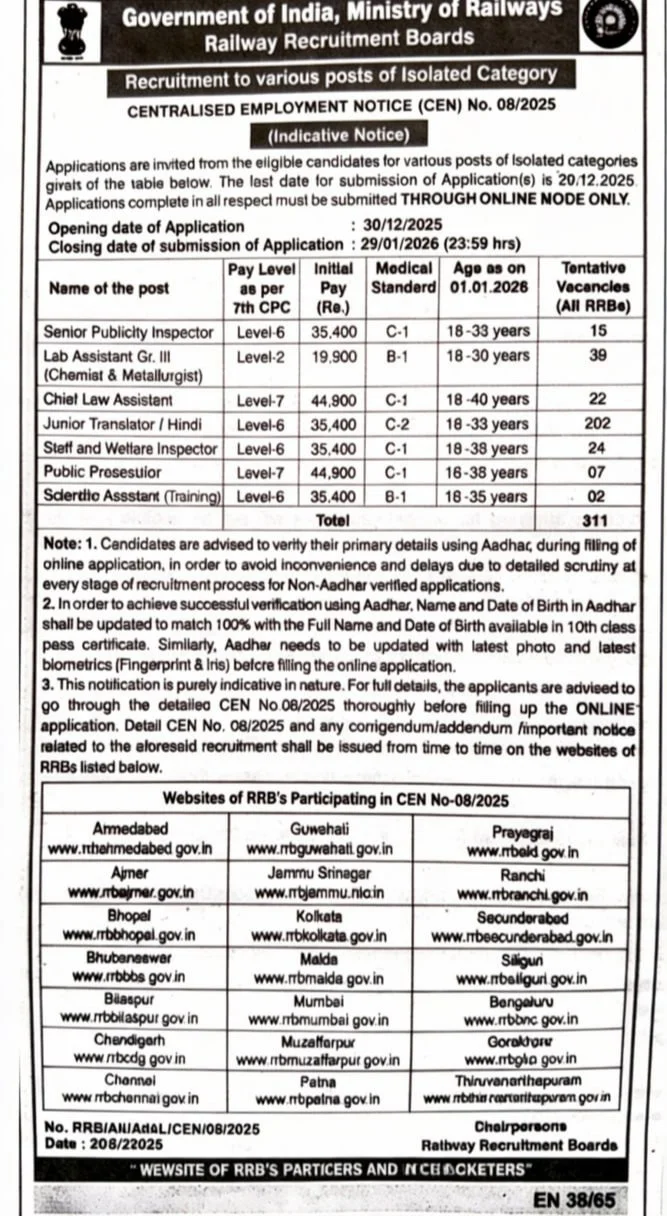 indianrailways.gov.in Railway Recruitment Boards (RRB) RRB Isolated Categories Recruitment 2026, Eligibility, Fee, Last Date, Apply Online, Authority has released the new notification for the recruitment of RRB Isolated Categories Senior Publicity Inspector, Lab Assistant Grade III (Chemist and Metallurgist), Chief Law Assistant, Junior Translator (Hindi), Staff and Welfare Inspector, Public Prosecutor and Scientific Assistant/ Training New Vacancy 2026 for 311 Posts, RRB Isolated Categories Online Registration Form 2026 has started from 30 December 2025 to 29 January 2026 through the official website of the Authority. The candidates who are interested in RRB CEN 08/2025 Isolated Categories Bharti 2026, kindly read the full notification related to RRB Isolated Categories Jobs 2026. Check Eligibility, Application Fee, Age Limit, Salary, Selection Process, and all other information. All the details related to the RRB Isolated Categories Online Registration Application Form 2026 Link are given below.